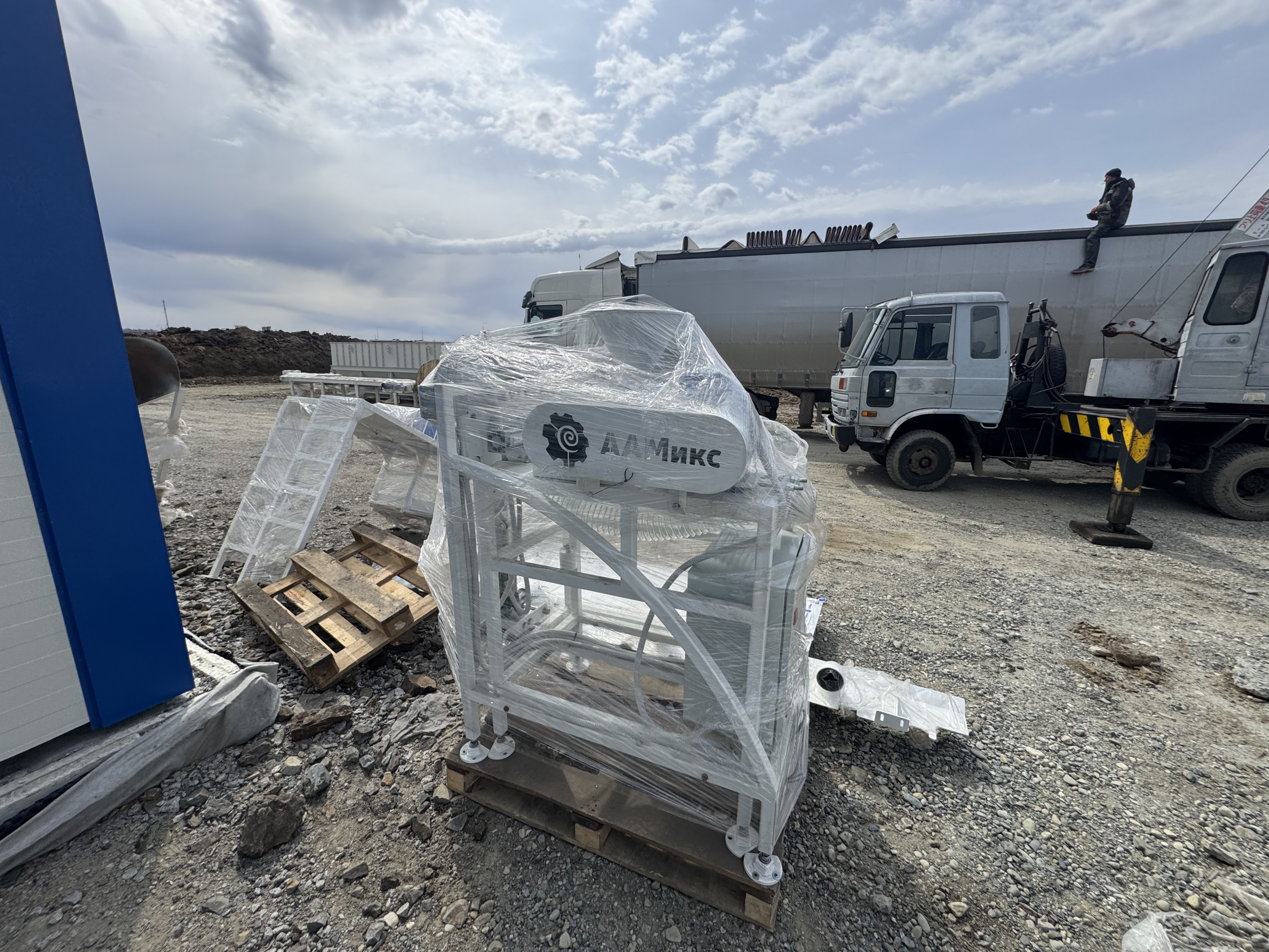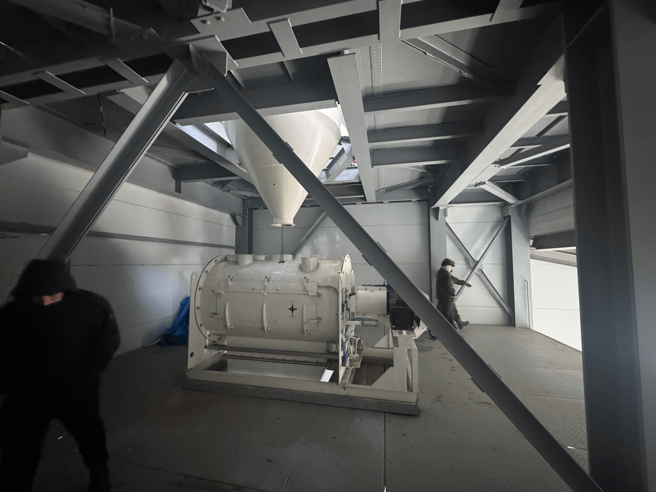 Участок смешивания собран. Главный элемент смешивания — плужковый смеситель сухих смесей Проф-СС-2200 на 2200 литров. За один цикл готовится партия, которой хватает на отделку нескольких квартир.