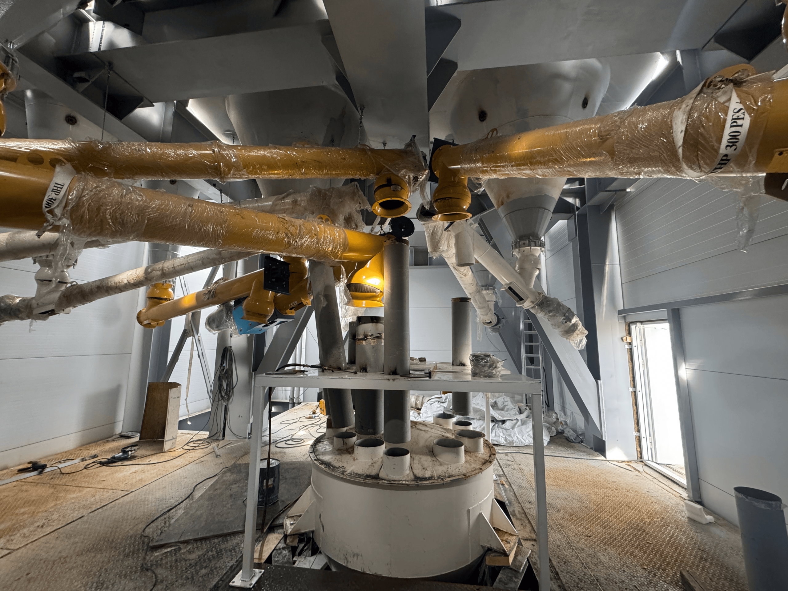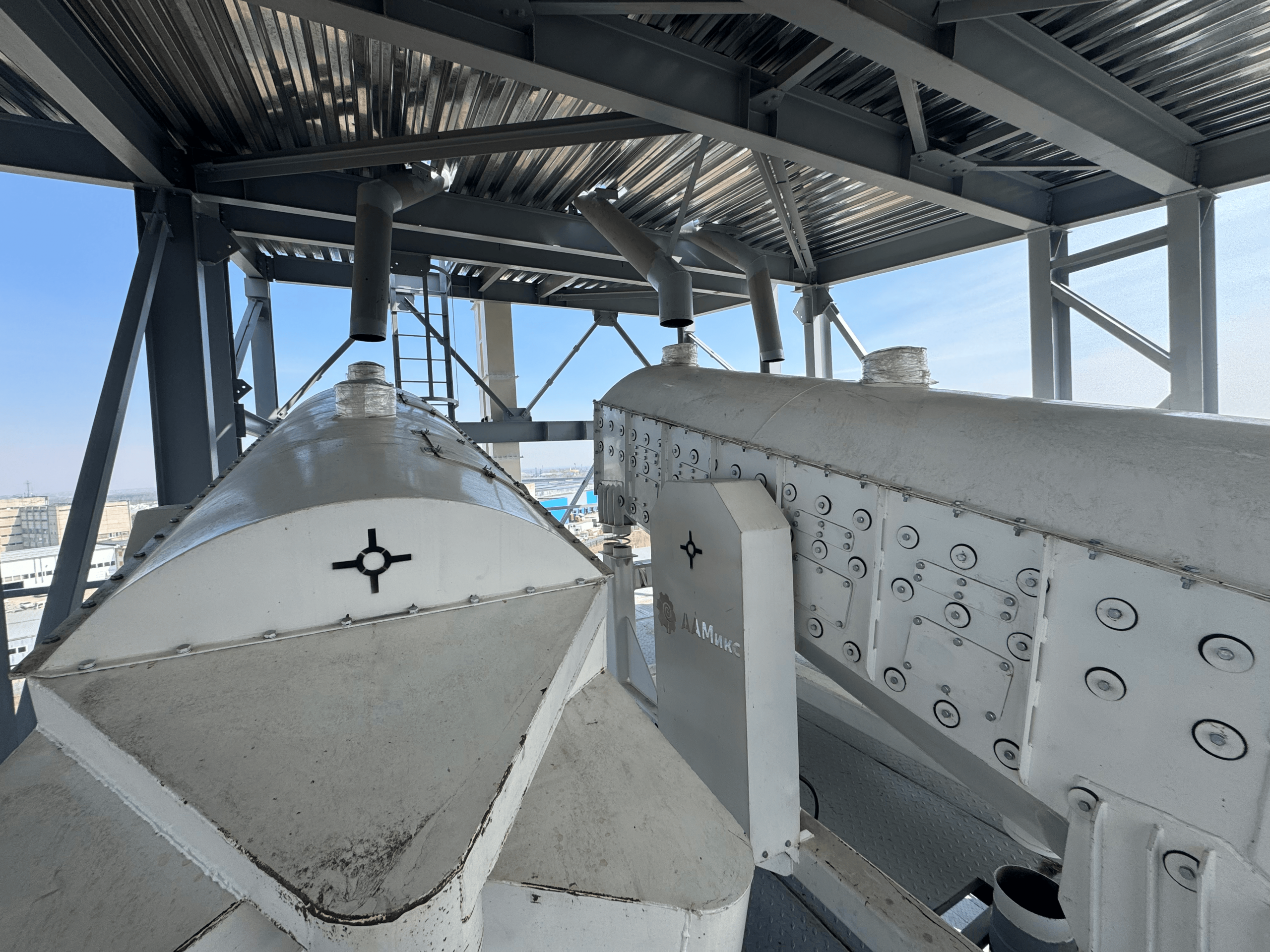 На все 10 силосов завода — каждый под свой продукт — установили аспирацию: фильтры серии Аэроклин Медиум Смарт собственного производства. Без них на площадке в радиусе сотен метров стояла бы пыль, а персонал работал бы в респираторах. Над фасовочными постами смонтировали 4-секционный приёмный бункер — он принимает готовую смесь от смесителя и распределяет её по постам.
