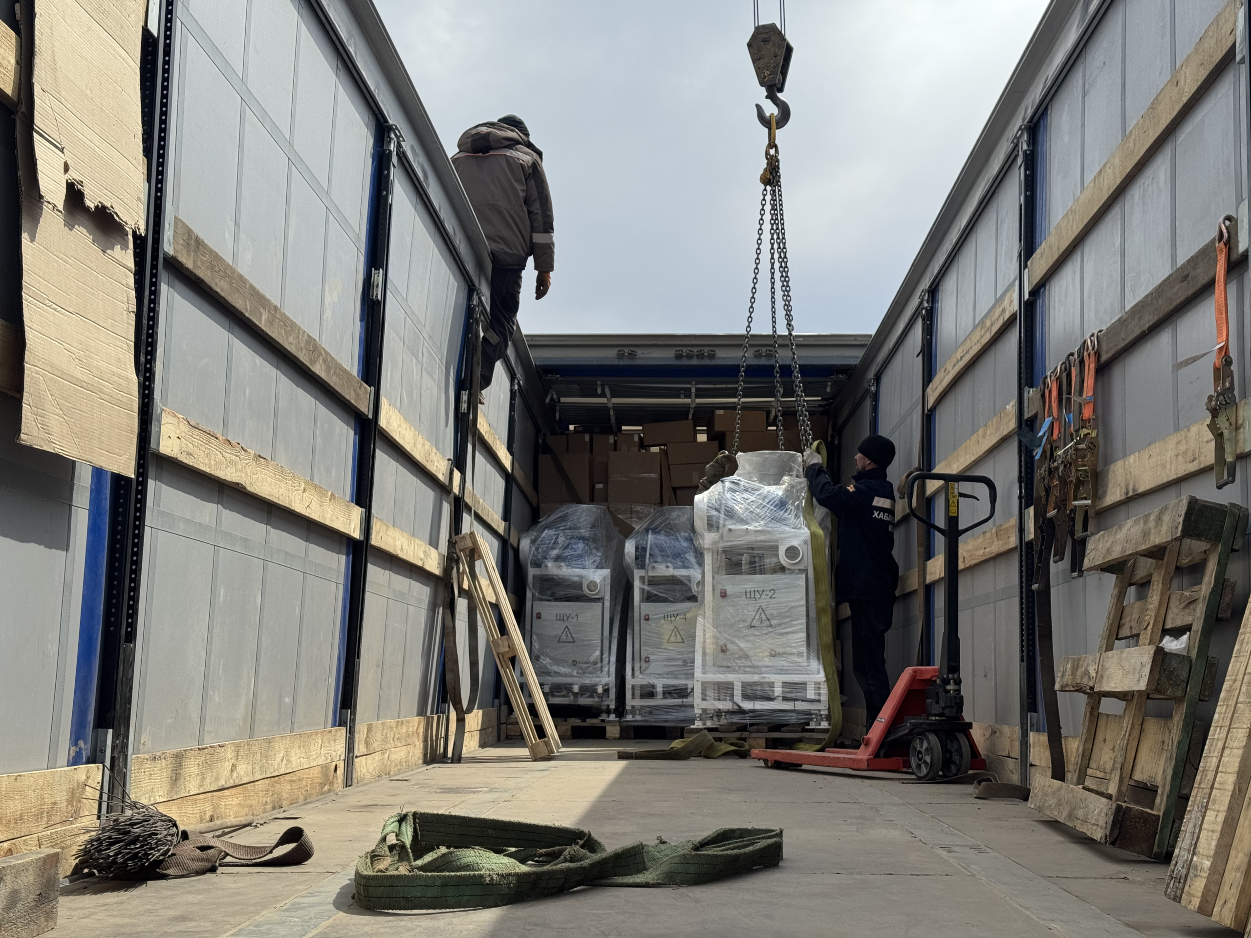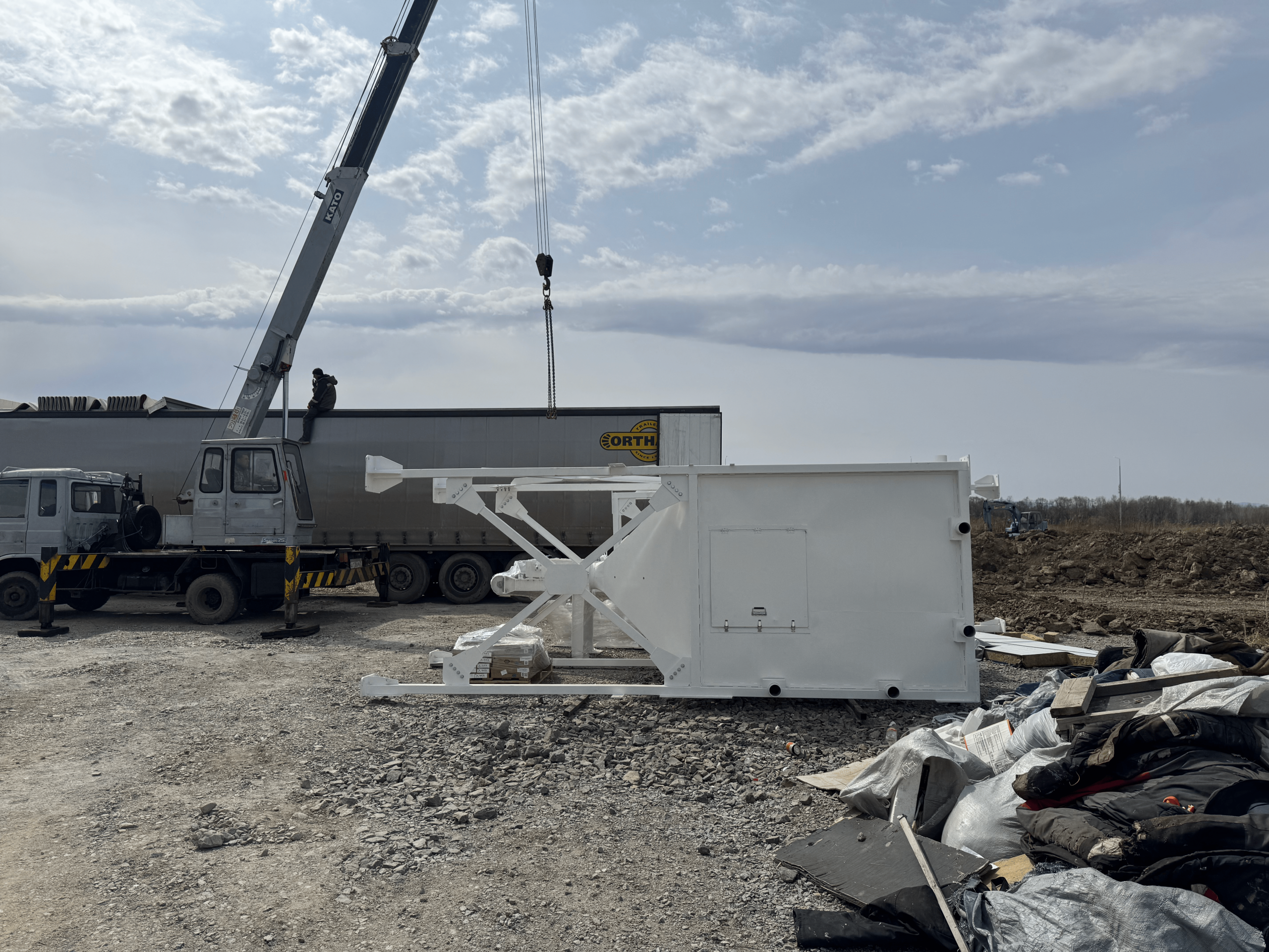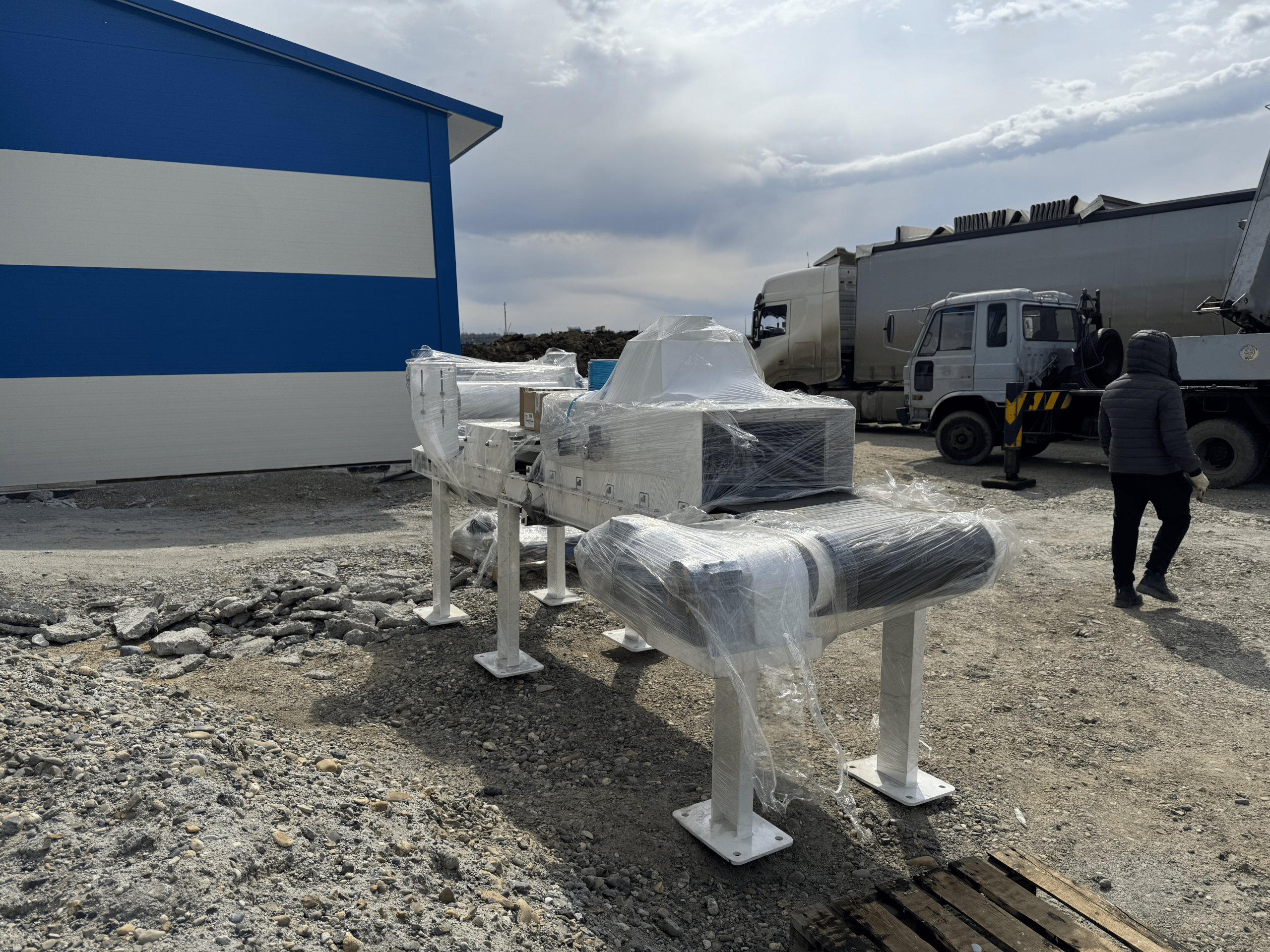 Линия фасовки — четырёхпостовая, под клапанные мешки. Все четыре фасовочные станции и комплект ленточных транспортёров доставлены на площадку, идёт монтаж.